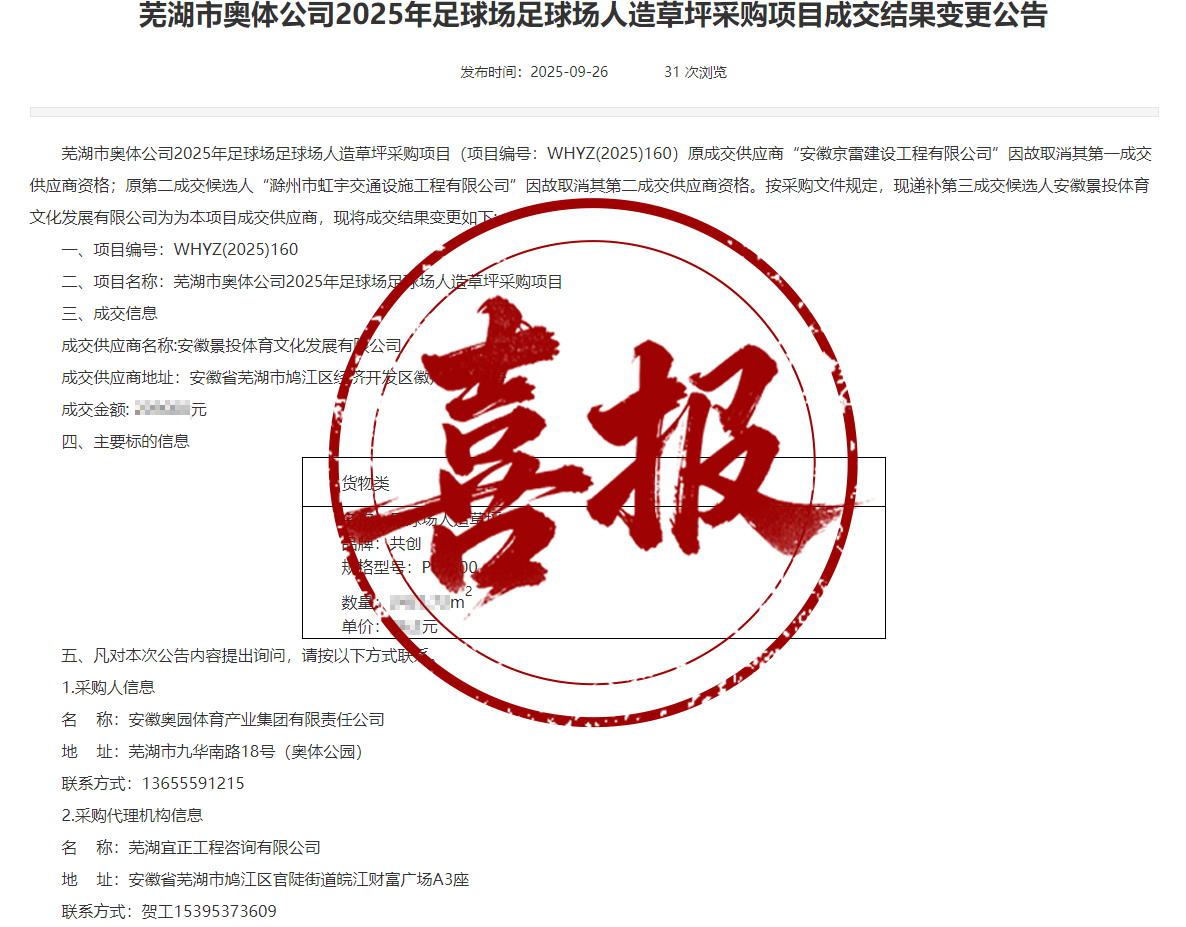 芜湖市奥体公司2025年足球场人造草坪采购项目成交结果变更公告